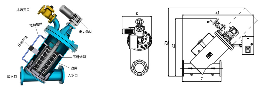 | 型號 | 管徑 | 出入水口 | Z | Z1 | Z2 | Z3 | K | 濾網面積 | 處理水量 | 重量 |