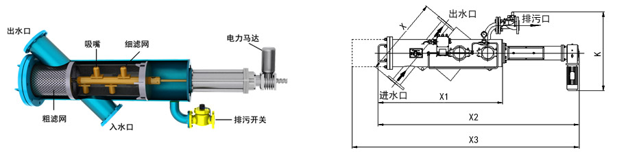 | 型號(hào) | 管徑 | 出入水口 | X | X1 | X2 | X3 | K | 過濾面積 | 處理水量 | 重量 |