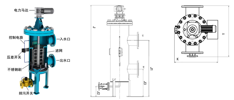 | 型號 | 管徑 | 出入水口 | J | J1 | J2 | J3 | Y | K | 濾網(wǎng)面積 | 處理水量 | 重量 |